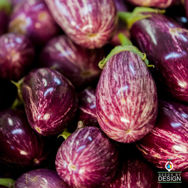 Pandora Striped Rose eggplants are a striking light pink color with white stripes. They are teardrop shaped and typically grow to be 5-6 inches long with no thorns. Each plant has productive yields and grows 30-48 inches in height.