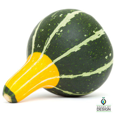 Pear gourds have a golden yellow top half with a dark green bottom half and horizontal white stripes on the whole fruit. Gourds are pear shaped and grow to be 2-3 inches long. Sometimes they are all yellow or all green as well. They have smooth hard exteriors.