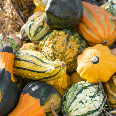 Bush plants produce all colors: orange yellow white and green gourds. These un-edible fruits are bumpy lumpy and winged each gourd weighs from 1/4 - 3/4 lb Plant some of these monsters for your goblins.