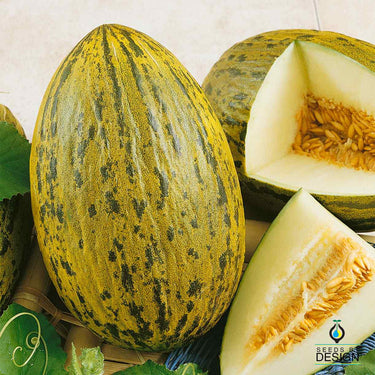 Rare melon from Spain oval fruit mottled green yellow skin 7-9 pounds 8-12 inch long sweet pale green to white flesh very hard rind fine keeper common European and Spanish markets.
