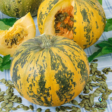 Striped F1 -- Hulless confectionary hybrid pumpkin. Grown many for its naked hulless greenish seeds nutritious and rich in protein seeds are great roasted or raw. Pumpkins weigh 8-12 lb they can be picked at either stage: yellow with green stripes or golden orange with broken green stripes. Up to 9-12 pumpkins per plant flesh is also tasty if baked up to one pound of pepitas per fruit.