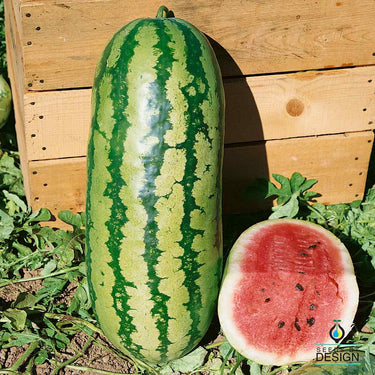Hard tough rind light-green skin with dark-green Rattlesnake markings 22-24 x 10-12 in. 35-45 lb firm sweet bright-rose flesh excellent quality AN resistant wilt susceptible popular attractive market melon in the South and East USDA Southeast Vegetable Breeding Lab/SC 1957.